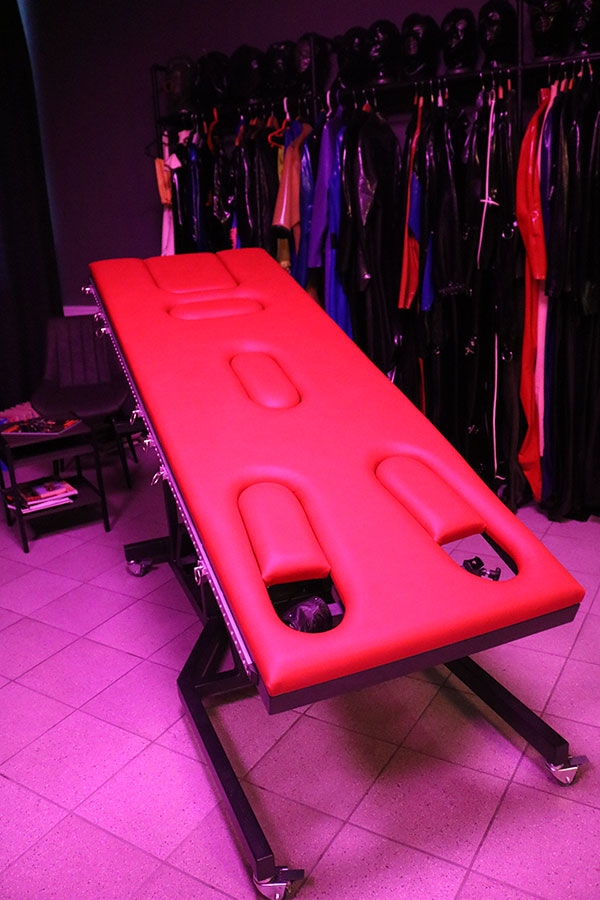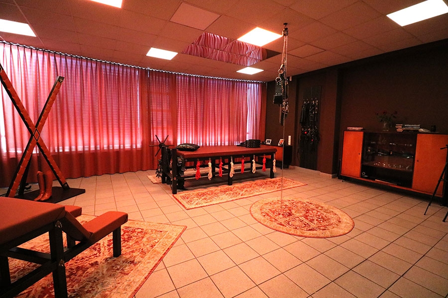 Das repräsentative stimmungsvolle 46 qm große Leder- und Bondage-Zimmer mit originellen Holz-Leder-Möbeln, wie große Streckbank, Strafbock und Andreaskreuz in warmen Lederfarben und echter Mid-Century-Design-Einrichtung lädt den Besucher auf eine bizarre Reise ein.
